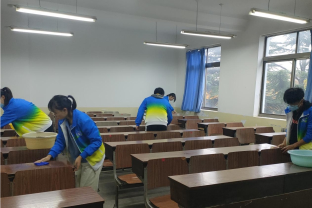 参加活动的人员于活动当天上午8:40在学校文化广场集合并分配活动任务,随后队长发放活动中所需物品。各小组长带领成员去各自的活动区域,各小组用自己携带的盆、桶和抹布等工具对课桌上的涂抹等痕迹进行了认真的擦拭,为确保任务的圆满完成,反复进行检查,每张课桌均需擦拭多次。最后,各小组在教学楼门前集合,相关人员收回剩余物品,由相关人员验收成果。