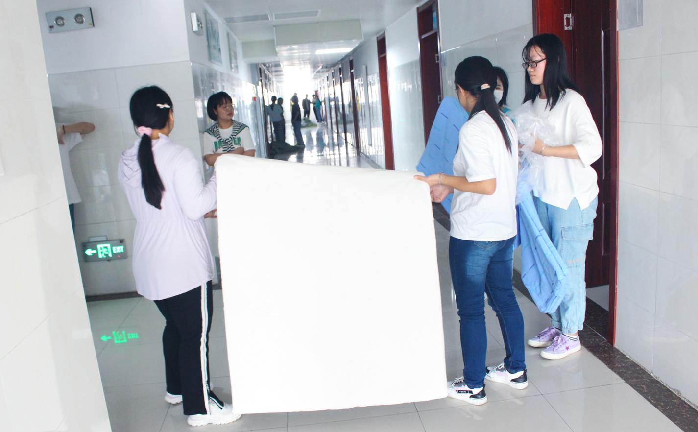 经过细致的清点,工作人员明确分工、迅速行动,两人成组、互相协作,有序将用品搬运至楼道并堆积整齐。随后,在相关负责人的指挥下,工作人员逐一为各宿舍发放用品。
