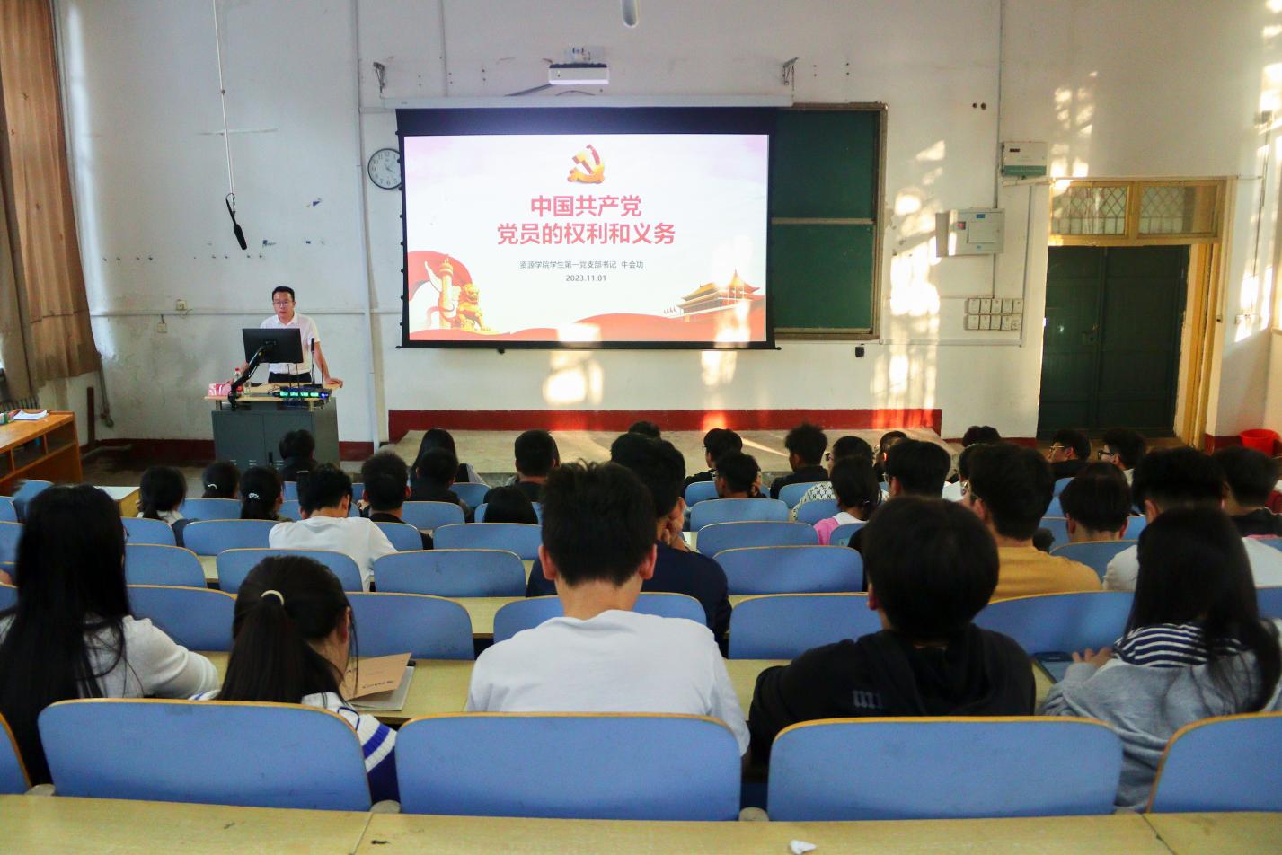 11月1日,伟德bv官网学生第一党支部书记、辅导员牛会功在1A107为入党积极分子讲授“中国共产党党员的权利和义务”专题党课。