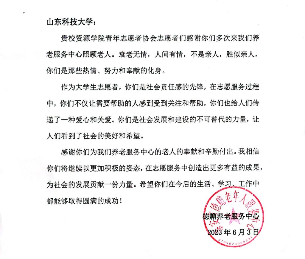 活动后,伟德bv官网收到德赡养老服务中心感谢信。志愿者们深受鼓舞,纷纷表示将进一步弘扬志愿服务精神,持续开展好校内外志愿服务活动,丰富活动载体,创新活动形式,让“奉献、友爱、互助、进步”的志愿服务精神在学院蔚然成风。(伟德bv官网供稿)