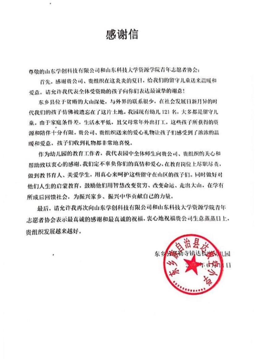 为呵护、助力留守儿童健康成长,近期,伟德bv官网举办“志温暖、愿同行”系列活动之关爱留守儿童明信片设计大赛,并向甘肃省临夏回族自治州东乡族自治县那勒寺镇达板空幼儿园留守儿童开展捐赠活动。6月14日,伟德bv官网收到了来自东乡县那勒寺镇达板空幼儿园的感谢信。