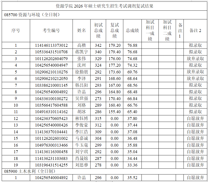 我院按照学校下达招生计划进行拟录取,若后期学校追加计划或公示名单中拟录取考生自愿放弃,将按照总成绩从高到低顺次进行待录取,并另行公示。最终拟录取名单由学校研究生院进行统一公示。